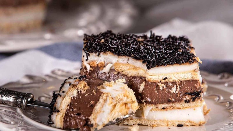 - Στρώνουμε μπισκότα βουτηγμένα στο γάλα – κονιάκ.