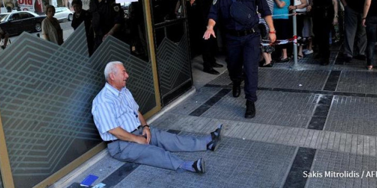 Οταν στην τέταρτη τράπεζα του είπαν ότι δεν μπορούσε να πάρει τα 120 ευρώ, δεν άντεξε. Κατέρρευσε κλαίγοντας. Η φωτογραφία αυτή έκανε τον γύρο του κόσμου. Και ήταν η πιο συγκλονιστική απεικόνιση της κλιμάκωσης της κρίσης στην Ελλάδα.