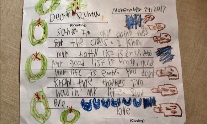 “Αυτό το κάνω μόνο για το σχολείο. Ξέρω ότι η λίστα σου με τους άτακτους είναι άδεια. Και η λίστα με τους καλούς είναι άδεια. Και η ζωή σου είναι άδεια. Δεν ξέρεις τι μπελάδες είχα στη ζωή μου. Αντίο”, γράφει το παιδί.