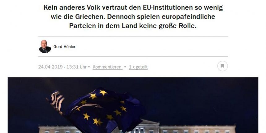 Η γερμανική οικονομική εφημερίδα επισημαίνει ότι «κανένας άλλος λαός δεν έχει τόσο λίγη εμπιστοσύνη στους θεσμούς της ΕΕ όσο οι Έλληνες. Παρ’ όλα αυτά όμως τα ευρωσκεπτικιστικά κόμματα δεν παίζουν ιδιαίτερο ρόλο και πολύ πιθανό μάλιστα να χάσουν ψήφους στις επερχόμενες ευρωκλογές».