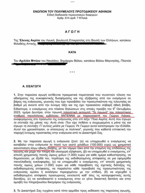 Η κ. Ακρίτα αντέδρασε άμεσα και κατέθεσε αγωγή ενώπιον του Πολυμελούς Πρωτοδικείου Αθηνών ζητώντας το ποσό των 100.000 ευρώ από τον Δήμαρχο Βόλου ως αποζημίωση.