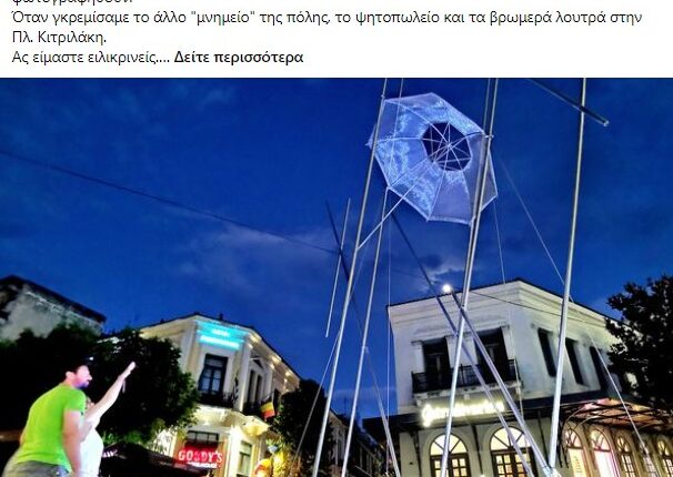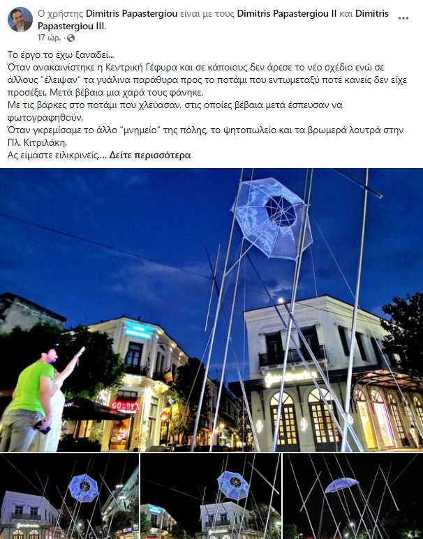 Απάντηση στις επικρίσεις και τα αρνητικά σχόλια Τρικαλινών για την τοποθέτηση του γλυπτού “Ομπρέλα” του Γ. Ζογγολόπουλου, στον πεζόδρομο της Ασκληπιού, δίνει  με ανάρτησή του στον προσωπικό του λογαριασμό στο facebook, ο δήμαρχος Τρικκαίων Δημήτρης Παπαστεργίου.