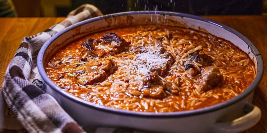 Αφαιρούμε από τη σάλτσα τα λαχανικά (κρεμμύδι, καρότο και πράσο) και περιχύνουμε με τη σάλτσα τα υλικά στο ταψί. Η σάλτσα πρέπει να καλύπτει το κριθαράκι. Αν έχει εξατμιστεί κατά το βρασμό προσθέτουμε βραστό νερό μέχρι να καλυφτούν 3 εκατοστά πάνω από το κριθαράκι.