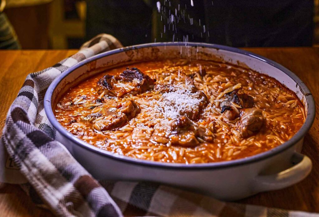 Αφαιρούμε από τη σάλτσα τα λαχανικά (κρεμμύδι, καρότο και πράσο) και περιχύνουμε με τη σάλτσα τα υλικά στο ταψί. Η σάλτσα πρέπει να καλύπτει το κριθαράκι. Αν έχει εξατμιστεί κατά το βρασμό προσθέτουμε βραστό νερό μέχρι να καλυφτούν 3 εκατοστά πάνω από το κριθαράκι.