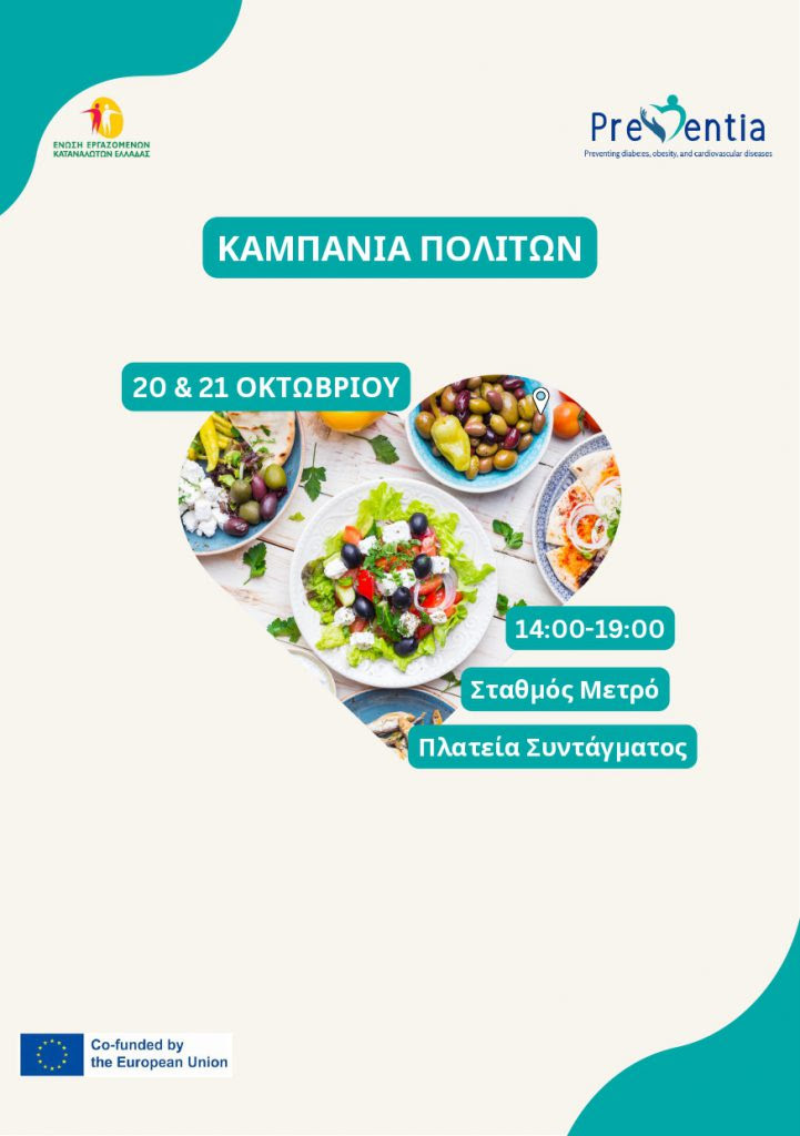 | Στις 20 και 21 Οκτωβρίου 2025, από τις 2:00 μ.μ. στην Πλατεία Συντάγματος στην Αθήνα, θα πραγματοποιηθεί η εκδήλωση Preventia: ένα συμμετοχικό και διαδραστικό ευρωπαϊκό εγχείρημα αφιερωμένο στην πρόληψη των μη μεταδοτικών ασθενειών, όπως ο διαβήτης και τα καρδιαγγειακά νοσήματα.