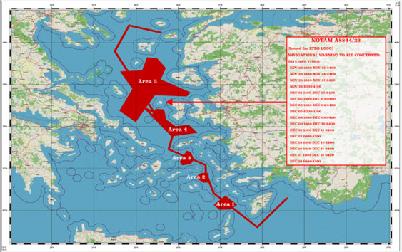 Ενώ στην Αθήνα αναμένουν στις 7 Δεκεμβρίου τον πρόεδρο της Τουρκίας, Ρετζέπ Ταγίπ Ερντογάν, η Αγκυρα: 1) Εχει εκδώσει «νόταμ» και αφενός μπλοκάρει, αφετέρου διχοτομεί το Αιγαίο από τις 27 Νοεμβρίου ως τις 17 Δεκεμβρίου. Είναι, ως εκ τούτου, σαφές το μήνυμα προς την Αθήνα.