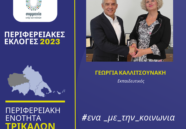 Την εκπαιδευτικό Γεωργία Καλλιτσουνάκη που κατέρχεται υποψήφια περιφερειακή σύμβουλος στην Π.Ε. Τρικάλων στις αυτοδιοικητικές εκλογές του Οκτωβρίου, καλωσόρισε ο Περιφερειάρχης Θεσσαλίας Κώστας Αγοραστός στον συνδυασμό «Συμμαχία υπέρ των πολιτών» που έχει σταθερά στο επίκεντρο τον άνθρωπο, αγωνίζεται με έργα, δράσεις, πρωτοβουλίες για μια Περιφέρεια χωρίς διακρίσεις και αποκλεισμούς.