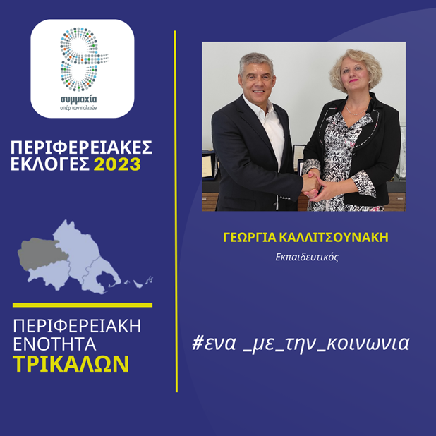 Την εκπαιδευτικό Γεωργία Καλλιτσουνάκη που κατέρχεται υποψήφια περιφερειακή σύμβουλος στην Π.Ε. Τρικάλων στις αυτοδιοικητικές εκλογές του Οκτωβρίου, καλωσόρισε ο Περιφερειάρχης Θεσσαλίας Κώστας Αγοραστός στον συνδυασμό «Συμμαχία υπέρ των πολιτών» που έχει σταθερά στο επίκεντρο τον άνθρωπο, αγωνίζεται με έργα, δράσεις, πρωτοβουλίες για μια Περιφέρεια χωρίς διακρίσεις και αποκλεισμούς.