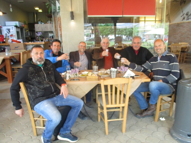 Οι παλιοί συνάδελφοι Κ. Λαναράς, Π. Ζάχος, Κ. Γρηγορίου, Ι. Τσακνάκης και Β. Δεσίκος, μαζί με τον ιδιοκτήτη του καταστήματος Π. Σακελλαρίου απολαμβάνουν το τσιπουράκι και τις γεύσεις του και ξεχνάν τις …περικοπές τους