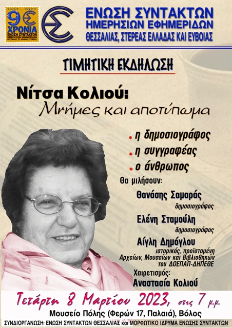 Η εκδήλωση: «Νίτσα Κολιού-Μνήμες και αποτύπωμα. Η δημοσιογράφος, η συγγραφέας, ο άνθρωπος», θα πραγματοποιηθεί την Τετάρτη, 8 Μαρτίου 2023, στις 7 το απόγευμα, στο Μουσείο Πόλης (Φερών 17, Παλαιά, Βόλος). Για την Νίτσα Κολιού θα μιλήσουν οι δημοσιογράφοι Θανάσης Σαμαράς και Ελένη Σταμούλη, η ιστορικός και προϊσταμένη Αρχείων, Μουσείων και Βιβλιοθηκών του ΔΕΟΠΑΠ-ΔΗΠΕΘΕ Βόλου κ. Αίγλη Δημόγλου, ενώ χαιρετισμό θα απευθύνουν ο πρόεδρος της Ένωσης Συντακτών και του Μορφωτικού Ιδρύματος Γ. Τσιγκλιφύσης και η Αναστασία Κολιού στενό συγγενικό πρόσωπο της αείμνηστης δημοσιογράφου.