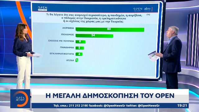 Την ακρίβεια θεωρεί ως το μεγαλύτερο πρόβλημα η συντριπτική πλειοψηφία των πολιτών, σε ποσοστό 60%, όπως αναδεικνύεται στη μεγάλη δημοσκόπηση της Alco, που παρουσιάστηκε στο κεντρικό δελτίο ειδήσεων του OPEN. Επιπλέον, οι πολίτες σε ποσοστό 49% θεωρούν ότι τα μέτρα της κυβέρνησης δεν αντιμετωπίζουν «καθόλου» την ακρίβεια, ενώ το 23% «λίγο».