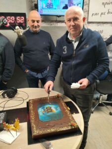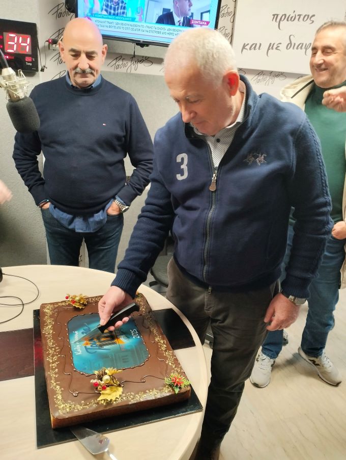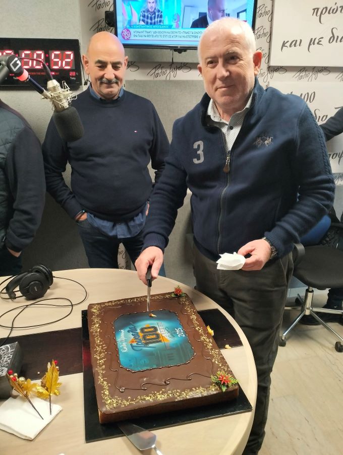 Τη πίτα έκοψε ο  ένας εκ των  ιδιοκτητών του FM 100 Ράδιο Ζυγός, Φάνης Σεριστατίδης παρόντος και του έτερου ιδιοκτήτη Θοδωρή Ευθυμίου.