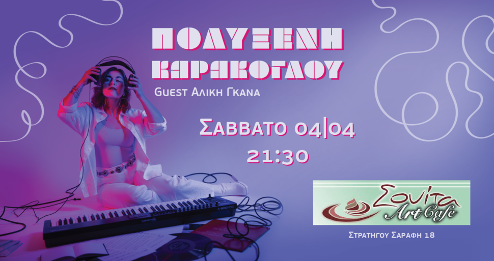 Η Πολυξένη Καράκογλου μας προσκαλεί το Σάββατο 4 Απριλίου στο καλλιτεχνικό στέκι «Σουίτα Art Cafe», στα Τρίκαλα, για να μας παρουσιάσει μία “Solo” μουσική παράσταση! Μια προσπάθεια σύνδεσης και υπενθύμισης του πιο απλού. Ένας προς έναν η Πολυξένη και οι θεατές, διαμορφώνουν μια μυσταγωγική συναυλία. Άλλοτε με πιο ηλεκτρονικούς ήχους και άλλοτε με το πιάνο της, μας δίνει απλόχερα την παλέτα των συναισθημάτων που την διαμορφώνουν. Καλεσμένη της η Αλίκη Γκανά!