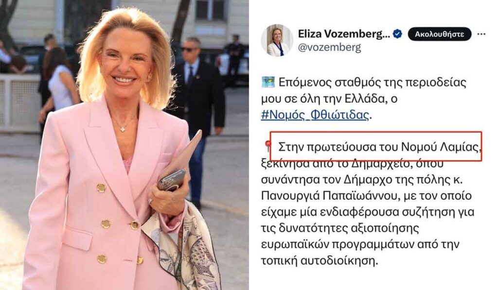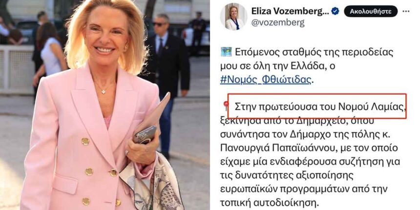 Στον νομό… Λαμίας βρέθηκε η Ελίζα Βόζεμπεργκ στο πλαίσιο της περιοδείας της για τις ευρωεκλογές της 9ης Ιουνίου, όπως η ίδια ενημέρωσε τους διαδικτυακούς της ακόλουθους. Η υποψήφια ευρωβουλευτής της Νέας Δημοκρατίας μάλλον δεν γνώριζε ότι η Λαμία είναι η πρωτεύουσα της Περιφερειακής Ενότητας Φθιώτιδας (από το 2011 δεν υφίστανται πλέον νομοί) και νόμιζε πως η Λαμία ήταν η πρωτεύουσα του νομού… Λαμίας.