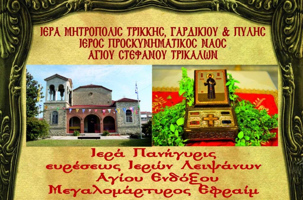 Φέρεται εις γνώσιν των ευλαβών Χριστιανών ότι την 3ην Ιανουαρίου 2025 Πανηγυρίζει μεγαλοπρεπώς ο Ιερός Προσκυνηματικός Ναός Αγίου Στεφάνου Τρικάλων την εύρεση των Ιερών Λειψάνων του Αγίου Ενδόξου Μεγαλομάρτυρος Εφραίμ του εκ Τρίκκης καταγομένου. Οι εορταστικές εκδηλώσεις θα λάβουν χώρα κατά το κάτωθι πρόγραμμα: ΠΕΜΠΤΗ 2 ΙΑΝΟΥΑΡΙΟΥ, ΩΡΑ 5:30 μ.μ.: Μέγας Πανηγυρικός Αρχιερατικός Εσπερινός Χοροστατούντος του Σεβασμιωτάτου Μητροπολίτου Τρίκκης, Γαρδικίου και Πύλης κ. ΧΡΥΣΟΣΤΟΜΟΥ μετ’ αρτοκλασίας και Θείου Κηρύγματος. ΩΡΑ 6:30 – 8:30 μ.μ.: Η ακολουθία των Μεγάλων και Βασιλικών Ωρών των Θεοφανείων Χοροστατούντος του Σεβασμιωτάτου Μητροπολίτου Τρίκκης, Γαρδικίου και Πύλης κ. ΧΡΥΣΟΣΤΟΜΟΥ. ΠΑΡΑΣΚΕΥΗ 3 ΙΑΝΟΥΑΡΙΟΥ, ΩΡΑ 7:30-10:00 π.μ.: Όρθρος και εν συνεχεία Πανηγυρική Θεία Λειτουργία. ΩΡΑ 5:30 – 7:00 μ.μ.: Ιερά Παράκληση και Εγκώμια ενώπιον του Ιερού Λειψάνου και της Ιεράς Εικόνος του Αγίου ενδόξου Μεγαλομάρτυρος Εφραίμ του εκ Τρίκκης. Κατά τη διάρκεια της Πανηγύρεως θα τεθεί για προσκύνηση απότμημα Ιερού Λειψάνου του Αγίου Εφραίμ που φυλάσσεται στον Ιερό Ναό. Παρακαλούνται οι φιλέορτοι και φιλακόλουθοι Χριστιανοί να προσέλθουν και να λάβουν τη χάρη και ευλογία του Αγίου. Ο ΝΑΟΣ ΤΗΝ ΠΑΡΑΣΚΕΥΗ ΘΑ ΕΙΝΑΙ ΣΥΝΕΧΩΣ ΑΝΟΙΧΤΟΣ ΑΠΟ 7:00 ΤΟ ΠΡΩΙ ΕΩΣ ΤΙΣ 9:00 ΤΟ ΒΡΑΔΥ