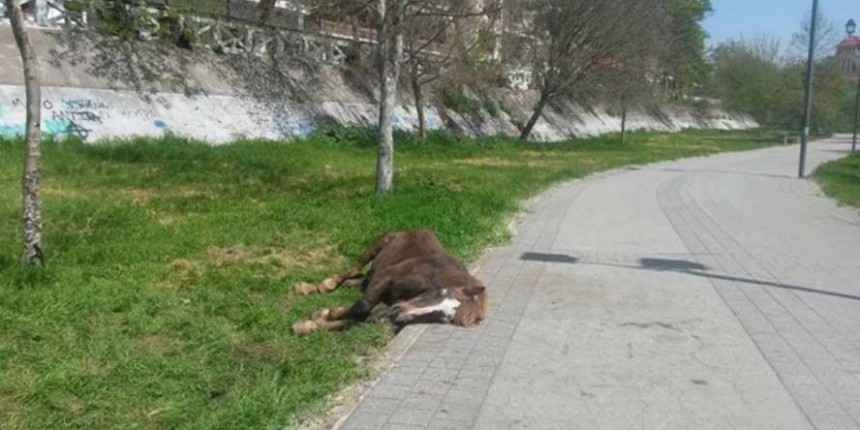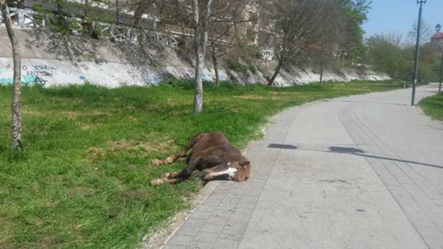 Θεατές μίας αποτροπιαστικής εικόνας γίνονται τις τελευταίες ώρες Λαρισαίοι στην περιοχή του Αλκαζάρ, εκεί όπου ένα άλογο κείτεται και αργοπεθαίνει αβοήθητο.