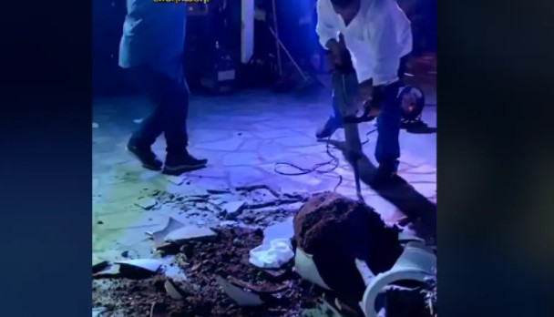 Όπως φαίνεται και στο βίντεο, οι καλεσμένοι δεν αρκέστηκαν στο σπάσιμο πιάτο, αλλά αποφάσισαν να ξηλώσουν ακόμα και τα πλακάκια του χώρου, χρησιμοποιώντας ένα… κομπρεσέρ!