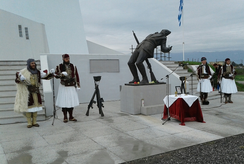 Άφιξη του αγήματος των «Φουστανελοφόρων της Ράξας» στον χώρο του Μνημείου (6ο χλμ Ε.Ο. Τρικάλων-Καρδίτσας).