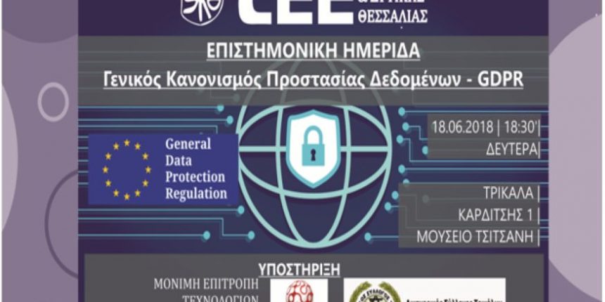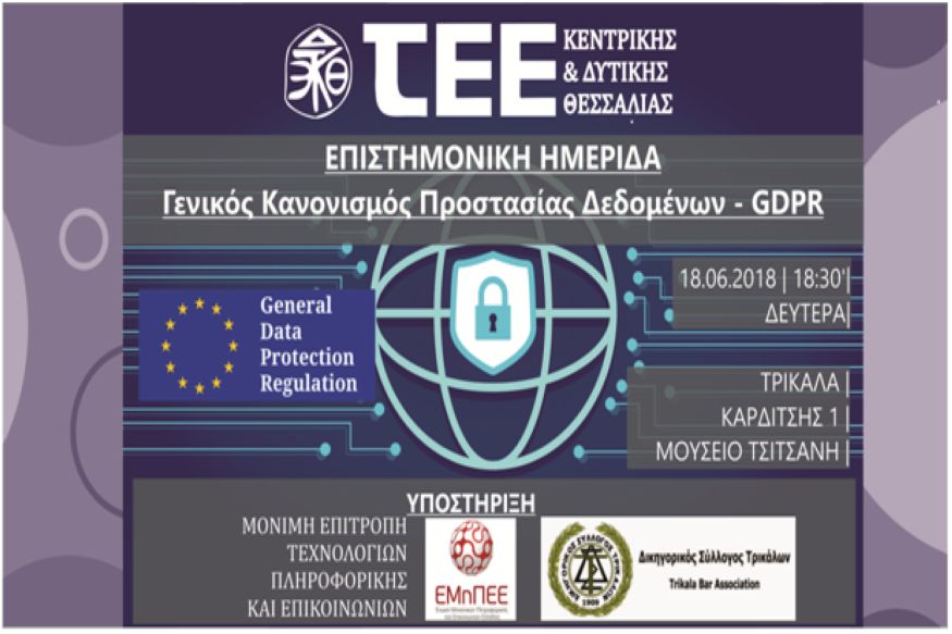 Το TEE Κεντρικής και Δυτικής Θεσσαλίας, διοργανώνει Ενημερωτική Ημερίδα με θέμα «Γενικός Κανονισμός Προστασίας Δεδομένων – GDPR», στα Τρίκαλα, τη Δευτέρα 18.06.2018 και ώρα 18:30, Καρδίτσης 1, (Μουσείο Τσιτσάνη).