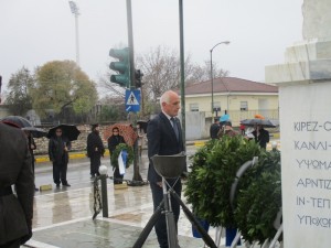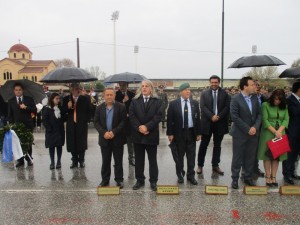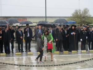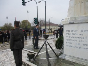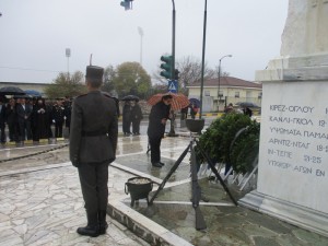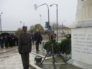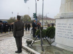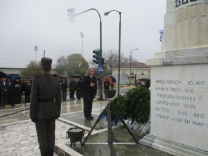 Ακολούθησε κατάθεση στεφάνων από τον αντιπεριφερειάρχη Χρ. Μιχαλάκη, τον διοικητή της ΣΜΥ ταξίαρχο κ. Λιάκο, τον δήμαρχο Τρικάλων Δημ. Παπαστεργίου την περιφερειακή διευθύντρια εκπαίδευσης Θεσσαλίας Ελένη Αναστασοπούλου, την εκπρόσωπο των Αναπήρων Πολέμου τον αστυνομικό διευθυντή Θ. Γραβάνη, τον εκπρόσωπο της Πυροσβεστικής Υπηρεσίας, τον πρόεδρο του Επιμελητηρίου Β. Γιαγιάκο, τον πρόεδρο του ΤΕΕ Γ. Μητσιούλη, καθώς και από εκπροσώπους φορέων, όπως Εμπορικός Σύλλογος, Ομοσπονδία ΕΒΕ, Σύνδεσμος Αποστράτων Σωμάτων Ασφαλείας , Λέσχη Ειδικών Δυνάμεων, Σύνδεσμο Εφέδρων Αξιωματικών, Ισραηλιτική Κοινότητα.
