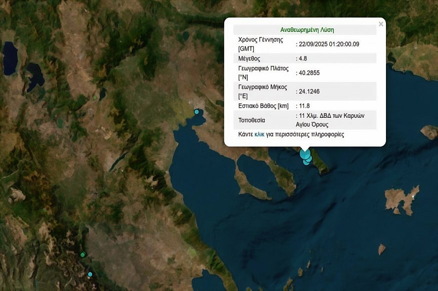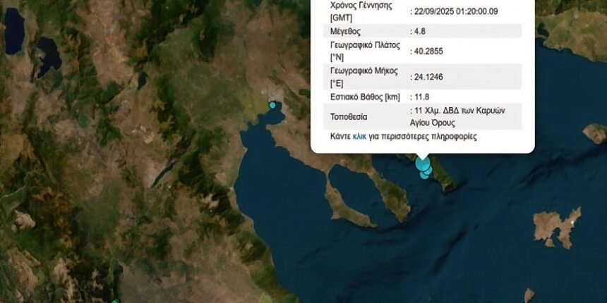 Σεισμική δόνηση μεγέθους 4,8 βαθμών της κλίμακας Ρίχτερ, σύμφωνα με την αναθεωρημένη λύση του Γεωδυναμικού Ινστιτούτου του Αστεροσκοπείου Αθηνών, σημειώθηκε τα ξημερώματα της Δευτέρας (22/9), στις 04:20, σε περιοχή του Αγίου όρους.