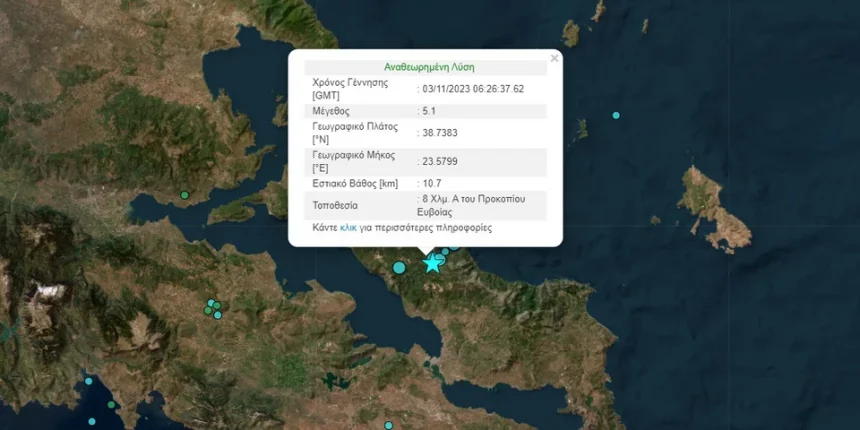 Σύμφωνα με το Γεωδυναμικό Ινστιτούτο ο σεισμός είχε ισχύ 5,1 Ρίχτερ, με επίκεντρο την Εύβοια.