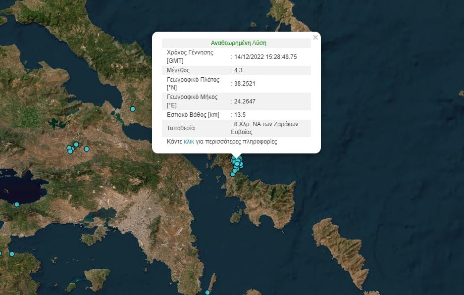 Σεισμός σημειώθηκε πριν από λίγο στην Εύβοια, ο οποίος έγινε αισθητός και στην Αττική. Σύμφωνα με το Γεωδυναμικό Ινστιτούτο, ο σεισμός ήταν μεγέθους 4,3 βαθμών της κλίμακας Ρίχτερ, με επίκεντρο 8 χλμ νοτιοανατολικά των Ζαράκων στην Εύβοια. Το εστιακό βάθος υπολογίζεται σε 13,5 χλμ.