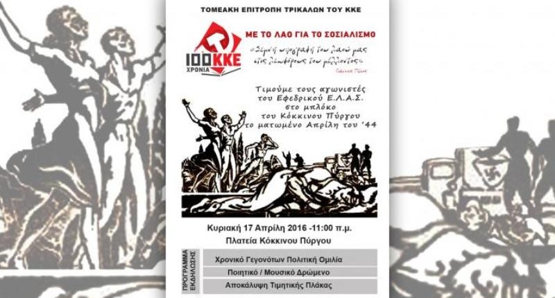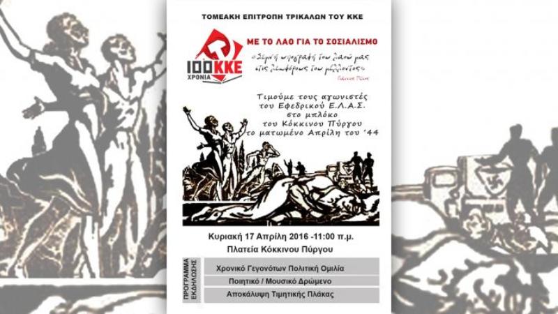 Η Τομεακή Επιτροπή Τρικάλων του ΚΚΕ , στο πλαίσιο σειράς εκδηλώσεων προς την πορεία συμπλήρωσης των 100 χρόνων ζωής και δράσης του Κόμματος , διοργανώνει πολιτική εκδήλωση τιμής και διδαγμάτων με ιστορική αναφορά του «μπλόκου» , από του ναζί κατακτητές και τους ντόπιους συνεργάτες τους , στον Κόκκινο Πύργο Τρικάλων ,τον ματωμένο Απρίλη του 1944.