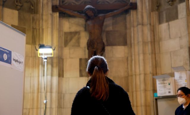 A woman waits for a dose of Comirnaty, the Pfizer-BioNTech vaccine against the coronavirus disease (COVID-19), at a vaccination center in St. Stephen's Cathedral in Vienna, Austria February 5, 2022. REUTERS/Leonhard Foeger