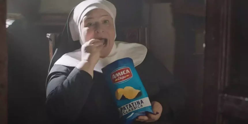 Η διαφήμιση διάρκειας 30 δευτερολέπτων για τα Amica Chips – μια από τις κορυφαίες μάρκες για πατατάκια στην Ιταλία – λαμβάνει χώρα σε ένα μοναστήρι με πρωταγωνίστριες μοναχές που ετοιμάζονται να λάβουν τη Θεία Κοινωνία.