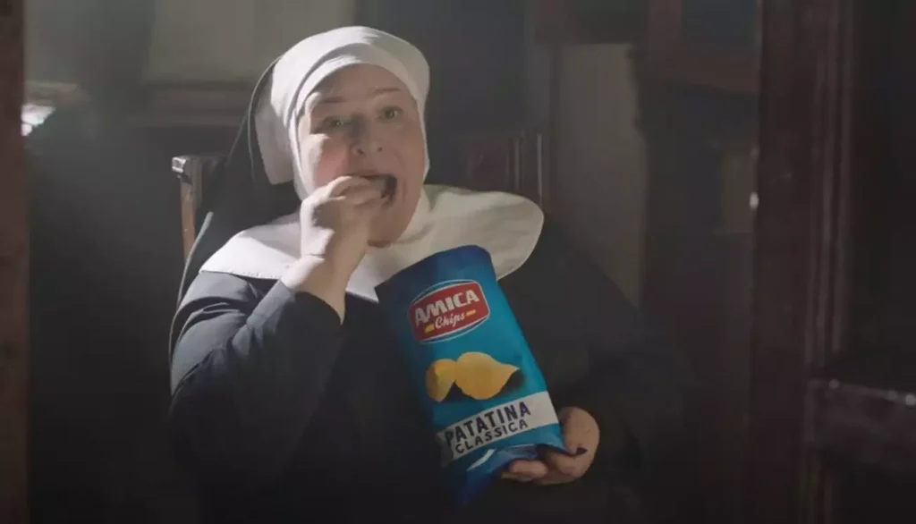 Η διαφήμιση διάρκειας 30 δευτερολέπτων για τα Amica Chips – μια από τις κορυφαίες μάρκες για πατατάκια στην Ιταλία – λαμβάνει χώρα σε ένα μοναστήρι με πρωταγωνίστριες μοναχές που ετοιμάζονται να λάβουν τη Θεία Κοινωνία.