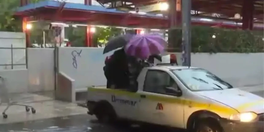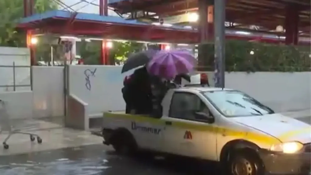 Το φορτηγάκι του δήμου Μοσχάτου πάρκαρε έξω από τον σταθμό του ηλεκτρικού και αρκετοί πολίτες ανέβηκαν στην καρότσα του προκειμένου να περάσουν χωρίς να κινδυνεύσουν από την «λίμνη» που είχε δημιουργηθεί.