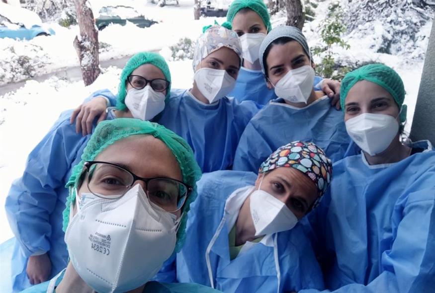 Μία μητέρα ανηλίκου που ήταν στο πόστο της για πάνω από 48 ώρες, μία μητέρα δύο ανήλικων που έκανε δύο συνεχόμενες νοσηλευτικές βάρδιες. Τέσσερα κορίτσια χωρίς καν μόνιμη δουλειά, που αποκλείστηκαν στο νοσοκομείο, και δούλεψαν και το επόμενο πρωί», γράφει η νοσηλεύτρια για τα πρόσωπα της φωτογραφίας και προσθέτει.