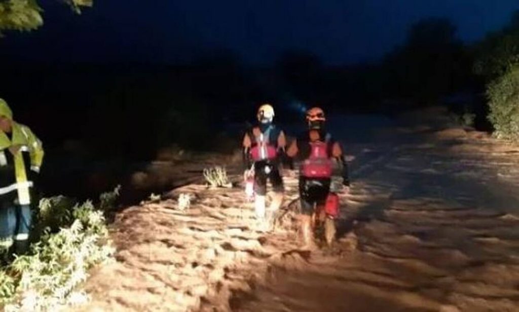 Το όχημά τους παρασύρθηκε από τα νερά της βροχής, τα οποία έχουν μετατρέψει το σημείο σε χείμαρρο, και οι ίδιοι είναι αδύνατο να μετακινηθούν.