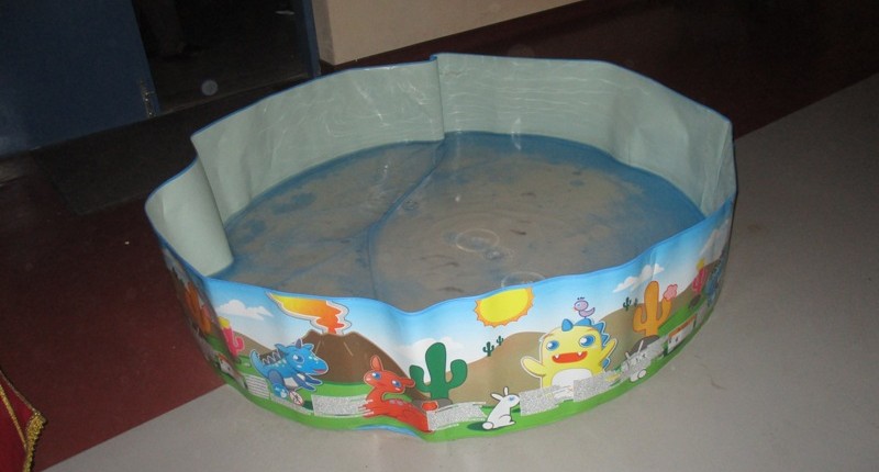 Οι εκπαιδευτικοί του σχολείου για να αντιμετωπίσουν την κατάσταση τοποθέτησαν μικρή παιδική πλαστική πισίνα ώστε να μαζεύονται τα νερά.