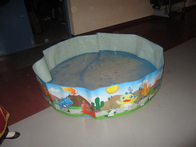 Οι εκπαιδευτικοί του σχολείου για να αντιμετωπίσουν την κατάσταση τοποθέτησαν μικρή παιδική πλαστική πισίνα ώστε να μαζεύονται τα νερά.