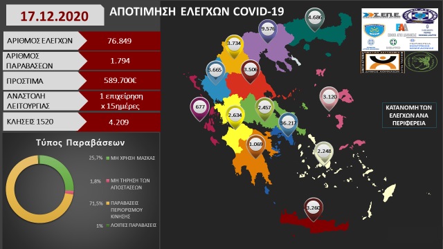 Αναλυτικότερα, οι αρμόδιες ελεγκτικές υπηρεσίες (ΕΛ.ΑΣ., Λιμενικό Σώμα, ΔΙ.Μ.Ε.Α., Ε.Α.Δ., Σ.ΕΠ.Ε, Δημοτική Αστυνομία, Περιφέρειες) διενήργησαν χθες Πέμπτη συνολικά 76.849 ελέγχους και κατέγραψαν 1.794 περιπτώσεις παράβασης των μέτρων επιδημιολογικού συναγερμού.