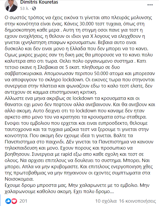 “Ο σωστός τρόπος να έχεις εικόνα τι γίνεται απο πλευράς μολυνσης στην κοινότητα είναι ένας. Κάνεις 30.000 τεστ τυχαια, όπως στη δημοσκοπηση καθε μερα . Αυτη τη στιγμη οσοι πανε για τεστ η εχουν ενοχλήσεις, η θελουν οι ιδιοι για Χ λογους να ελεγχθουν η γινεται ιχνηλατηση επαφων κρουσματων. Βεβαια αυτο ειναι δυσκολο και δεν ειναι μονο η Ελλαδα που δεν μπορει να το κανει. Ομως μικρες χωρες σαν τη δικη μας θα μπορουσε να το κανει πολυ καλυτερα απο οτι τωρα. Θελει πολυ οργανωμενο συστημα . Κατι τετοιο εκανε η Σλοβακια σε 5 εκατ. πληθυσμο σε δυο σαββατοκυριακα. Απομονωσαν περιπου 50.000 ατομα και μπορεσαν να αποφυγουν το σκληρο lockdown. Οι εικονες τωρα που στηνονται συνεργεια στην πλατεια και φωναζουν εδω το καλο τεστ ελατε, δεν αντεχουν σε καμια επιστημονικη κριτικη.