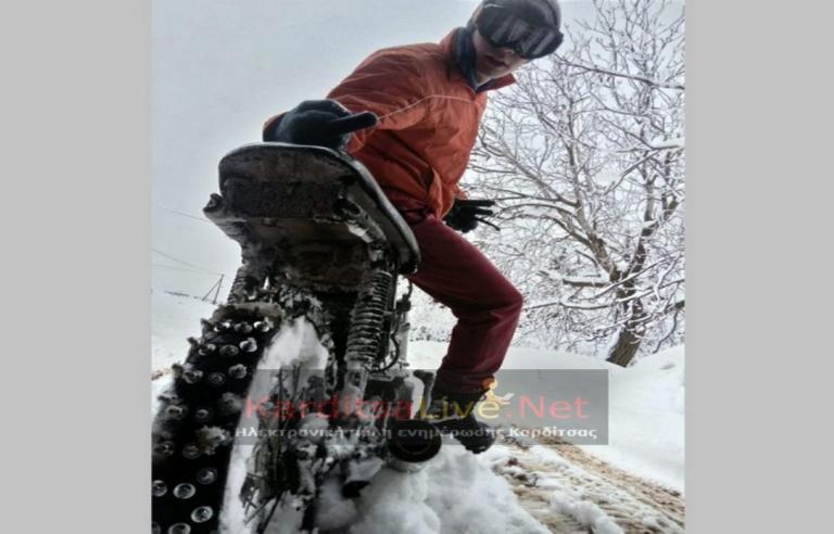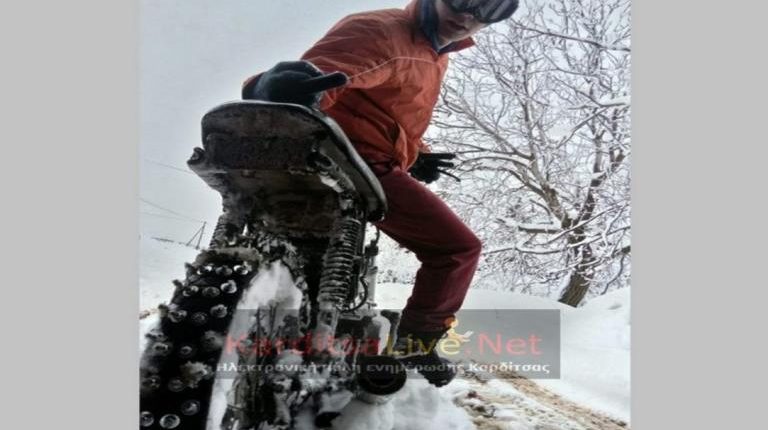 Όπως ανέφεραν στο karditsalive τοποθέτησαν στο πίσω ελαστικό (εφεδρικό) ενός δικύκλου πάρα πολλές βίδες για να μη γλιστρά και όπως θα δείτε στο βίντεο επίδειξης που έκαναν, όλα πήγαν εξαιρετικά στη συμπεριφορά του δικύκλου σε χιονισμένο δρόμο ή με παγετό.
