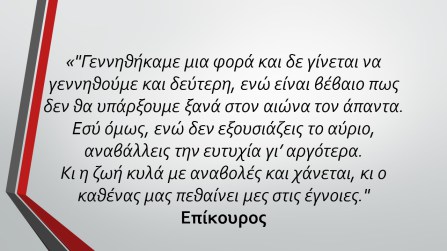 «”Γεννηθήκαμε μια φορά και δε γίνεται να γεννηθούμε και δεύτερη, ενώ είναι βέβαιο πως δεν θα υπάρξουμε ξανά στον αιώνα τον άπαντα. Εσύ όμως, ενώ δεν εξουσιάζεις το αύριο, αναβάλλεις την ευτυχία γι’ αργότερα.