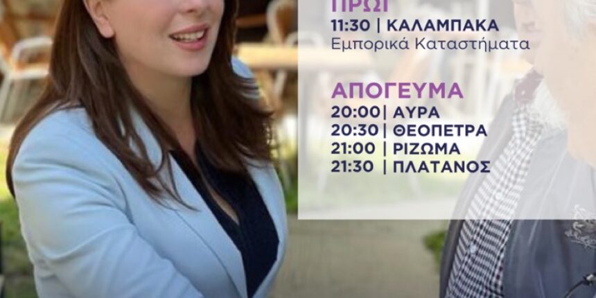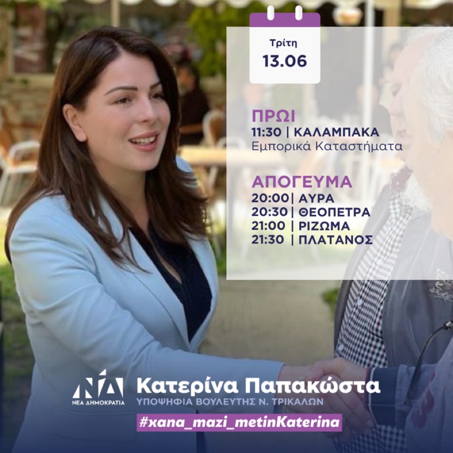 Την Τρίτη, 13 Ιουνίου 2023, η Υποψήφια Βουλευτής της Νέας Δημοκρατίας, Κατερίνα Παπακώστα, θα επισκεφθεί το πρωί τα Εμπορικά Καταστήματα της Καλαμπάκας, και το απόγευμα την Αύρα, τη Θεόπετρα, το Ρίζωμα και τον Πλάτανο.