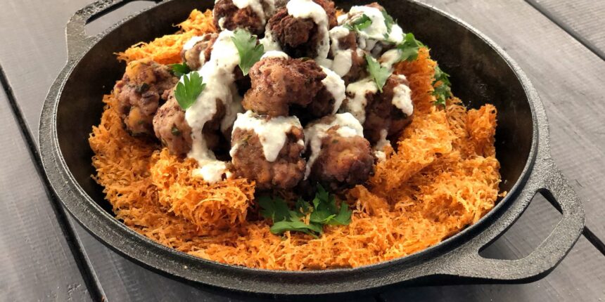 - Σερβίρουμε τα κεφτεδάκια πάνω από τις τραγανές πατάτες και περιχύνουμε με την κρέμα φέτας.