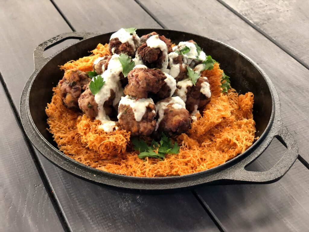 - Σερβίρουμε τα κεφτεδάκια πάνω από τις τραγανές πατάτες και περιχύνουμε με την κρέμα φέτας.
