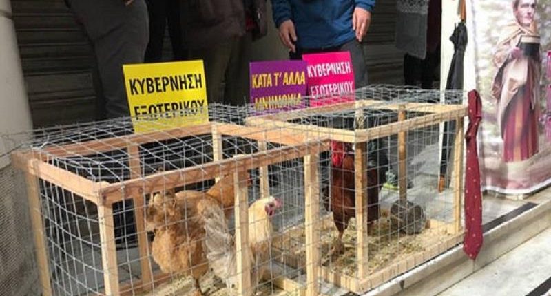 Σε πλαϊνό κλουβί, στο οποίο έχουν τοποθετήσει τις κότες, στην ταμπέλα αναγράφεται: «κυβέρνηση εξωτερικού». «Με αυτόν τον τρόπο, χαλαρά, συμπεριφέρονται στις επαφές που έχουν στο εξωτερικό», δήλωσαν.