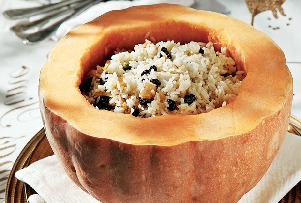 Έπειτα, βγάζουμε την κολοκύθα από το φούρνο και τη γεμίζουμε με το αρωματικό πιλάφι.