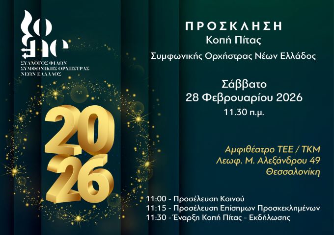 | Η Συμφωνική Ορχήστρα Νέων Ελλάδος (ΣΟΝΕ), με αισθήματα ειλικρινούς ευγνωμοσύνης και βαθιάς εκτίμησης, ευχαριστεί θερμά το κοινό για την συγκινητική ανταπόκριση και το εξαιρετικά αυξημένο ενδιαφέρον που εκδηλώθηκε για την επικείμενη εκδήλωση κοπής της πρωτοχρονιάτικης πίτας.