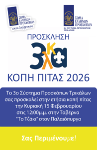 Κοπή πίτας του 3ου Συστήματος Προσκόπων Τρικάλων Κωνσταντίνος Καραποστόλης 12/02/2026 19:42 Τοπικά 1 Εμφανίσεις Την Κυριακή στις 15/02/2026 στις 12:00 το σύστημά μας κόβει την ετήσια πίτα. Θα χαρούμε να σας δούμε από κοντά. Post Views: 28 2026-02-12 Κωνσταντίνος Καραποστόλης Μοιράσου το Facebook Twitter