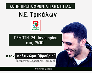 Την Πέμπτη 24 Ιανουαρίου, στις 7 μμ, στο Φρούριο Τρικάλων, θα πραγματοποιηθεί κοπή πίτας και ανοιχτή πολιτική εκδήλωση με το Γραμματέα του Κινήματος Αλλαγής Μανώλη Χριστοδουλάκη.