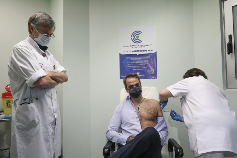 Στο πλευρό του πρωθυπουργού, όπως και στην πρώτη δόση του εμβολίου στις 27 Δεκεμβρίου, ήταν ο καθηγητής Λοιμωξιολογίας Σωτήρης Τσιόδρας.
