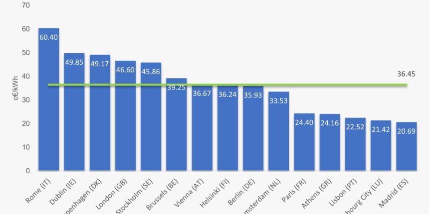 Τον Ιανουάριο στη χώρα μας η μέση τιμή της κιλοβατώρας διαμορφώθηκε στα 24,16 λεπτά, αρκετά πιο κάτω από τον ευρωπαϊκό μέσο όρο στα κυμαινόμενα τιμολόγια, ο οποίος είναι 36,45 λεπτά. Για ακόμα έναν μήνα είμαστε πολύ φθηνότεροι ακόμα κι από χώρες με ώριμες αγορές ενέργειας, όπως η Ιταλία (60,4 λεπτά), η Μεγάλη Βρετανία (46,6 λεπτά), η Γερμανία (35,93 λεπτά) κλπ.